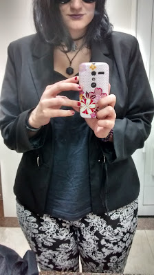 Jaqueta jeans preta, blusa preta básica mullet, saia com estampa preta e branca, meia de compressão, sapatilha de gatinho (a mesma do dia anterior). Batom roxo+preto )fiz um mistura doida e ele ficou um roxo acinzentado). Acessórios de sempre. Carinha de cansada, né?